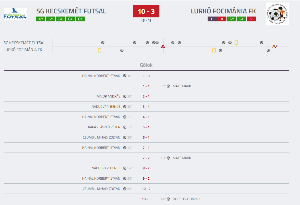 Biró Attila edzői értékelése: A mai napon ellenfelünk a Lurkó Focimánia FK volt, akik ellen sikerült újabb győzelmet aratnunk és ezzel megőriztük továbbra is a veretlenségünket. Viszont ma nem teljesen voltam elégedett a mutatott munkával, legfőbbképp az első 20 perccel, amikor is rendezetlenül, és nagyon kényelmesen játszottunk. Időben rendeztük a sorokat, és rendet raktunk a fejekben, aminek köszönhetően a mérkőzés további részében csak mi irányítottunk, és a mi akaratunk érvényesült, így sikerült megnyerni a mérkőzést 10-3-ra. Dolgoznunk kell keményen továbbra is, és figyelnünk, hogy ezek a rövidzárlatok ne forduljanak elő többet. Gratulálok a fiúknak a mai teljesítményhez, és hogy több pontrúgás gólt is szereztünk, aminek külön örvendek!